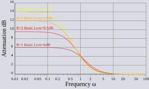 For audio lines, it is invariably necessary to combine L/C filter components with resistive attenuator components in the same filter section. The reason for this is that the usual design strategy is to require the section to attenuate all frequencies down to the level of the frequency in the passband with the lowest level. Without the resistor components, the filter, at least in theory, would increase attenuation without limit. The attenuation in the stop band of the filter (that is, the limiting maximum attenuation) is referred to as the "basic loss" of the section. In other words, the flat part of the band is attenuated by the basic loss down to the level of the falling part of the band which it is desired to equalise. The following discussion of practical sections relates in particular to audio transmission lines.