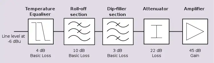 The most significant effect that needs to be compensated for is that at some cut-off frequency the line response starts to roll-off like a simple low-pass filter. The effective bandwidth of the line can be increased with a section that is a high-pass filter matching this roll-off, combined with an attenuator. In the flat part of the pass-band only the attenuator part of the filter section is significant. This is set at an attenuation equal to the level of the highest frequency of interest. All frequencies up to this point will then be equalised flat to an attenuated level. Above this point, the output of the filter will again start to roll-off.
