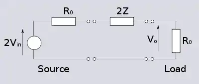 If a constant resistance circuit has an input Vin, then a generator with an impedance R0 must have an open-circuit voltage of E=2Vin in order to produce Vin at the input of the constant resistance circuit. If now the constant resistance circuit is replaced by an impedance of 2Z, as in the diagram above, it can be seen by simple symmetry that the voltage Vin will appear halfway along the impedance 2Z. The output of this circuit can now be calculated as,