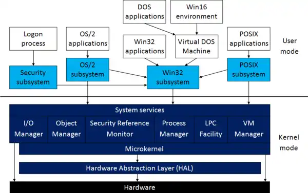 The third goal was called personality: The operating system should be able to run applications designed for various operating systems, such as Windows, MS-DOS and OS/2 applications.[4]: 54 The Mach kernel followed a similar concept by moving the APIs to components which operated in user mode as applications, these could be changed and new ones could be added. This principle was applied to Windows NT.[6]: 6